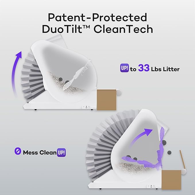 - ๐พ๐ก๐๐๐ฃ ๐พ๐๐๐ข๐ฅ๐๐ค๐ฃ: Two-stage tilting method combines passive & proactive operations (i.e. gravity sift and catapult dump) for thorough cleaning; leaves fewer scraps behind, dislodges sticky clumps, reduces dust created from abrasion, and minimizes stains trailed by runny poops